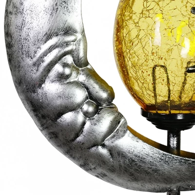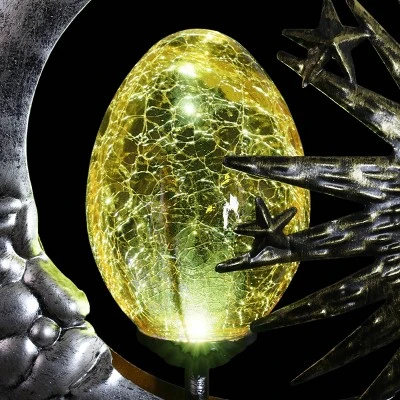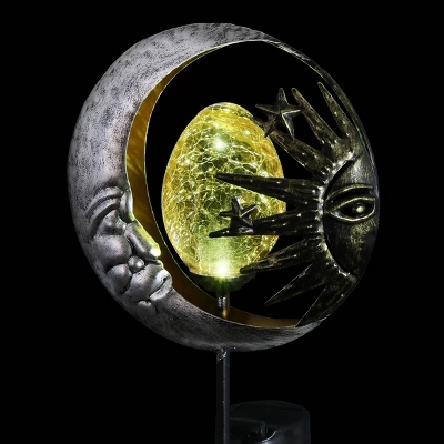 An enchanting amber glass ball illuminates at the center of this exquisitely designed sun and moon metal garden stake. This beautiful garden art adds a celestial touch to any landscape. Makes a wonderful gift.