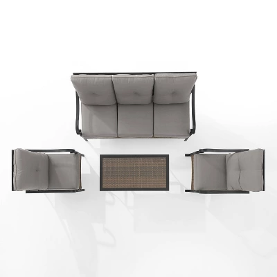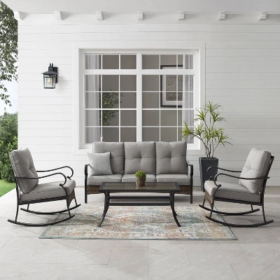 The Dahlia 4pc Sofa Set charms with traditional elements like curved arms and x-back seating. Constructed of powder-coated steel, the sofa and rocking chairs offer deep cushioned seats covered in spun polyester. The coffee table has a resin wicker top covered in tempered glass, which complements the wicker accents along the base of the seating. The Dahlia sofa set will be a unique addition to your patio or deck.