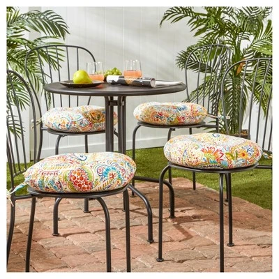Add a bit of comfort and style to your outdoor dining set with these Bistro Cushions from Kensington Garden. Cushions feature a center circle tack which prevents fill from shifting and bunching, and two string ties to keep cushions firmly secured to chairs. Each set includes four 15 inch round chair cushions made from 100% polyester, UV coated polyester fabric that is fade, stain and water resistant. The cushions are generously filled with a soft polyfiber made from 100% recycled, post-consumer plastic bottles for added comfort, strength and durability. A variety of colors and prints are available to enhance your outdoor decor.