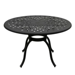 Constructed out of aluminum with a powder coated UV resistant finish this Modern Ornate Outdoor Mesh Aluminum 48-in Black Round Patio Dining Set with Four Chairs is designed to last a very long time. This patio dining set is a great fit for any patio, porch, deck, balcony or backyard. It comes with foot glides to protect any surface you place it on. The set weight is perfect allowing it to be easily moved but not able to be blown away by the wind. Use it for indoor or outdoor and commercial or residential applications.
