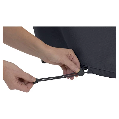 The Ravenna black grill covers combines striking style with durability, fade resistance and convenient features. Reinforced padded handles make removal easy while double-stitched seams add strength & a stylish accent. Perfect for Weber, Charbroil, Jennair, Cuisinart & Napoleon and other propane and natural gas grills. Structured vents stay open to prevent wind lofting and mildew and are lined with mesh barriers. Laminate backing keeps your grill dry while elastic hem cords move easily through a special channel for a snug fit. Four custom-colored buckles keep your cover secure in any weather. Adjustable webbing belts slide easily for a tailored look. Striped webbing adds an attractive accent and is unique to the Ravenna collection. Has a 4-year manufacturer’s warranty.