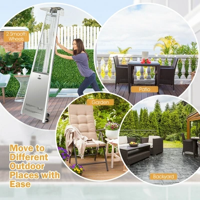 - Smooth Mobility: There are 2 smooth wheels on the bottom of this pyramid patio heater, which makes movement easier. Hence, you are able to move it to different places, such as patio, garden and backyard, etc. And the stainless steel material and ground fixers ensure durable and stable outdoor use.