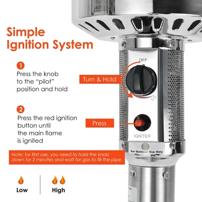 This patio propane heater is a great choice for you, which will extend your outdoor entertaining season and allows you to enjoy nature’s beauty even through chilly autumns and nippy winters. The reflector is 32’’ in diameter and can spread a wide, comfortable warmth throughout the surrounding area. Besides, you just need to press the ignition button to light this heater, and you can adjust the temperature from low to high as needed. Equipped with 2 wheels on the bottom, this patio heater allows you to move it effortless. In addition, the trip-over protection design and 3 stakes improve overall stability and safety.