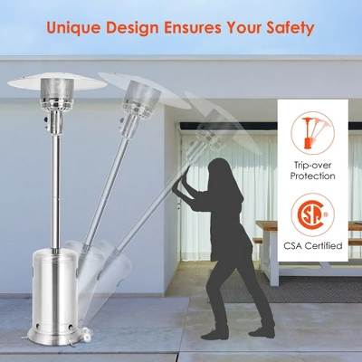 - Safety Protection: This outdoor heater adopts an anti-toppling design to turn the heater off automatically if it tips over by accident, and the patio heater with CSA certification makes you feel relieved to use it. Besides, 3 stakes increase overall stability and safety.