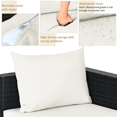 With contemporary and concise design, the set is perfect to be a great addition for your outdoor space. Made of premium steel and hand-woven rattan, the set is sturdy and will provide long time service. Each chair can hold around 360 lbs and the coffee table can hold up to 220 lbs. There are enough chairs to provide enough sitting space for 4-6 people. All the sofas and ottoman are equipped with soft and high-resilient cushion. And the cover of cushion is equipped with smooth zipper for removing and rinsing. The corner sofa with wide armrest is perfect to put your arm on. In addition, each piece of our set is independent, so it can be rearranged based on your preference.