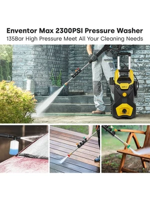 Clean even the toughest spots with the Electric Powered Pressure Washer from Enventor. It is incredibly powerful with a motor that generates 1800 watts and a water pressure that measures 2300 PSI for maximum cleaning power. Use it to clean cars, sheds, driveways, decks, and more. It will tackle even the most stubborn marks. Designed with four different cleaning modes, you will be able to choose the one that works best for your needs. The double leak-proof connector and metal water outlet will prevent breakage from the bottom of the area. In addition to the washer itself, it comes with a 20-foot pressure hose, a 16.5-foot power cable cord, a spray gun handle, a spray gun lance, a cleaning needle, a detergent bottle, and four spray nozzles. When you complete your task, simply store it away as it is easy to carry and is built with two wheels. For a clean surface after every use, get the Electric Powered Pressure Washer from Enventor.