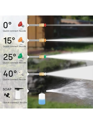 - MULTIPLE MODES: Four quick-connect metal nozzles provide strong water streams with different pressures for cleaning various surfaces from low pressure to high pressure. Use it for cleaning decks, sheds, cars, outdoors, and more.
