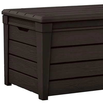 You can store various items in this 2-Pack of Keter Outdoor Storage Box and feel confident it will stay protected even in harsh weather conditions. This Keter 120-gallon deck box is designed for functionality and durability.Not only does the outdoor storage container stay strong during all types of weather it’s also maintenance-free, so you can assemble it without worrying about the upkeep. The large interior capacity of 120 gallons is perfect for storing large cushions, garden equipment, pool supplies, and more. These storage benches include a lockable feature to keep your items inside safe and secure (padlock not included).You can comfortably seat 2 adults allowing this storage box to double as a patio bench seating solution holding up to 804 pounds. With the stylish wood panel finish, this storage bench fits in with any outdoor theme or patio decor that does fade in the sun. The automatic opening system allows easy access to your contents inside. Store all your pool and outdoor supplies with the 2-Pack of Keter Brightwood 120-Gallon Storage Deck Box.