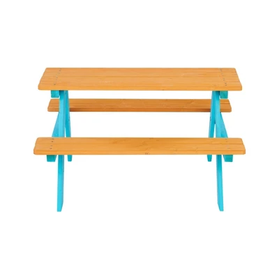 Teamson Kids’ solid wood picnic table features a warm honey color stained finish with a bright aqua base. The built-in benches offer seating for multiple kids around a durable solid wood A-frame. This table is ideal for any outdoor activities including snacktime and crafttime. The picnic set is made of spruce wood with an environmently friendly waterbased stain. To keep this table looking new, treat with a wood stain each year and store in a dry place for the winter. This kid sized table measures 35″ long, 31″ deep, and 19.75″ tall and is suitable for children ages 3 and up.
