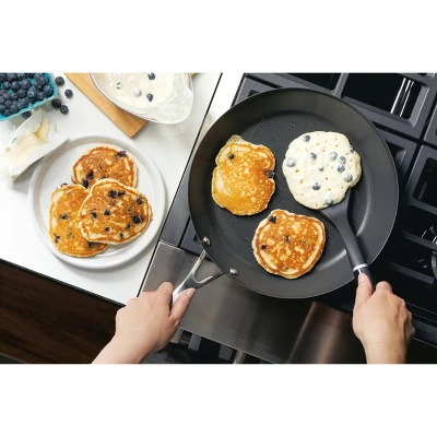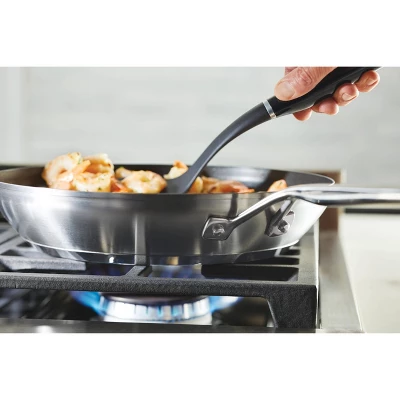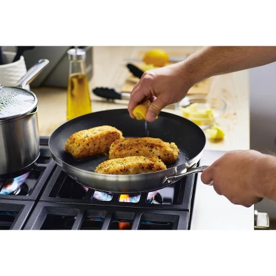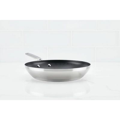 Experiment with and discover new flavors and techniques when cooking with the KitchenAid 3-Ply Base Stainless Steel Nonstick Frying Pan, designed with an extra thick layer of heat-conducting aluminum to eliminate hot spots by distributing heat evenly from edge to edge. Heavy-gauge stainless steel pan features a heavy bottom induction base for lasting durability and features a dual-riveted handle for strength and comfort when moving around the kitchen. Fry pan is finished with premium Triple-layer nonstick that is strong enough to stand up to daily wear and tear. Curious cooks can investigate a wider range of recipes in the oven, where cookware is safe to 500°F.