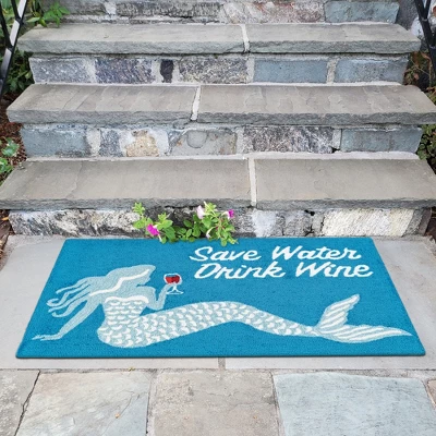 Our This Way To The Pool rug adds warmth and color to any indoor or outdoor living space. The perfect poolside accessory, in blue. Hand hooked of weather-resistant fiber, this collection is a blend of comfort, softness and durability. Frontporch is remarkably easy to clean and treated for added fade resistance. Limiting exposure to rain, moisture and direct sun will prolong mat life.