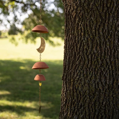 This wall hanging exclusively from Foreside Home & Garden is the perfect modern boho accent for any space in your home. Hand thrown terracotta bell shapes mixed with brass metal moon shapes create a cascading piece of art. The warm brass and golden terracotta hues add a fun pop of color wherever you decide to hang this beauty.