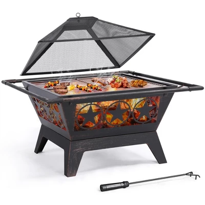 This iron fire pit is made of premium metal with a wear-resistant coating. Along with the package, we have 1 mesh cover, 2 grills, 4 side frames, 1 base, 1 fire poker, and also detailed instructions to guide you through the installation. Heating in winter, barbecuing in summer, or throwing a party, no matter which purpose you want, this fire pit would always serve well. SPECIFICATION:Material: ironColor: BronzeOverall size: 32 x 32 x 25.2inch (L x W x H); The external size of the fire bowl: 25.5 x 25.2 x 9.6inch (L x W x H); The internal size of the fire bowl: 22.5 x 22.5 x 9inch (L x W x H); The size of the Grills: 23″ x 11.5″The height of the bowl: 16″The height of the legs: 6.5″The length of the poker: 20″The bottom size of the fire bowl: 18.5″ x 18.5″Max. weight capacity: 22lb; G.W.: 27lb; N.W.: 22lbPlease see the image for exact measurements.